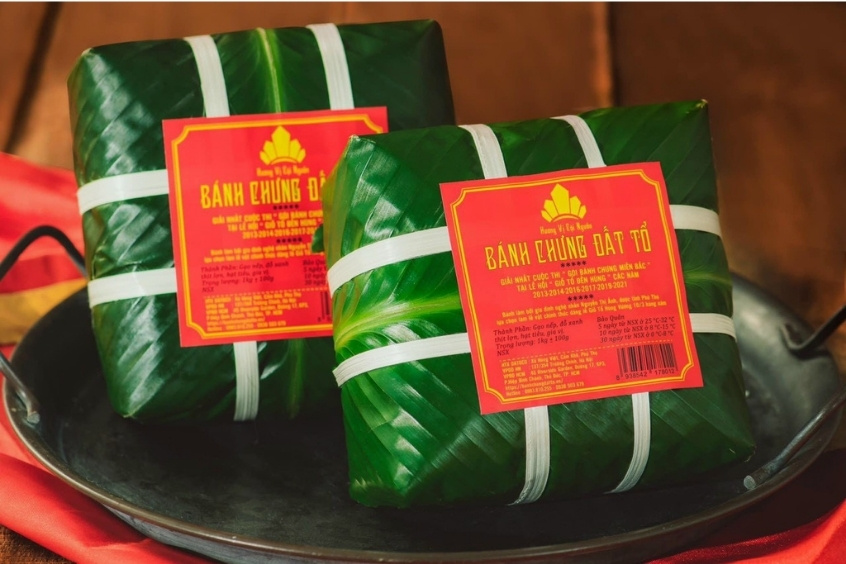 Bánh chưng Đất Tổ được làm từ những nguyên liệu tuyển chọn kỹ lưỡng: gạo nếp cái hoa vàng thơm dẻo, đỗ xanh lòng vàng bùi tơi, thịt lợn ba chỉ tươi ngon và tiêu hạt thơm nồng. Tất cả được gói ghém cẩn thận trong lớp lá dong xanh mướt, buộc chặt bằng lạt tre. Sau hàng giờ đồng hồ luộc trong nồi nước lớn, chiếc bánh chưng vuông vức ra đời với hương thơm nếp mới, đỗ xanh bùi béo và thịt mỡ tan chảy, tạo nên một hương vị truyền thống khó quên.