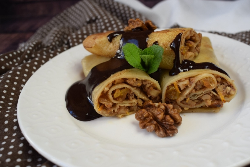 Bánh crepe mỏng được làm từ bột, sữa và trứng, sau đó được tráng nóng trên chảo. Món bánh được nhồi nhân là hỗn hợp kem làm từ hạt óc chó, nho khô và vỏ cam, sau đó được phủ một lớp sốt sô cô la nóng chảy và rượu rum. Khi thưởng thức, bạn sẽ cảm nhận được sự mềm mịn của lớp bánh crepe, vị béo của kem, vị chua nhẹ của nho khô, và hương thơm nồng nàn của rượu rum.