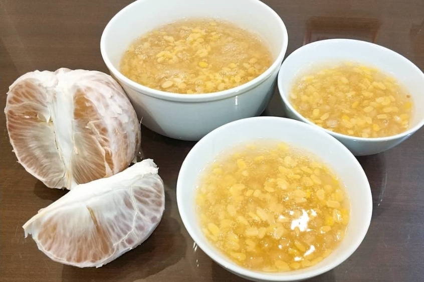 Điểm đặc biệt và cũng là linh hồn của món chè này chính là phần cùi bưởi được sơ chế vô cùng công phu. Cùi bưởi phải được gọt khéo léo, loại bỏ hết phần đắng, sau đó ngâm qua nhiều công đoạn để trở nên trong veo, giòn sần sật như thạch. Khi thưởng thức, những hạt cùi bưởi dai giòn quyện cùng đậu xanh béo bùi và nước cốt dừa sánh mịn, thơm lừng sẽ tạo nên một cảm giác vừa thanh mát, vừa đậm đà, khó quên trong khoang miệng.